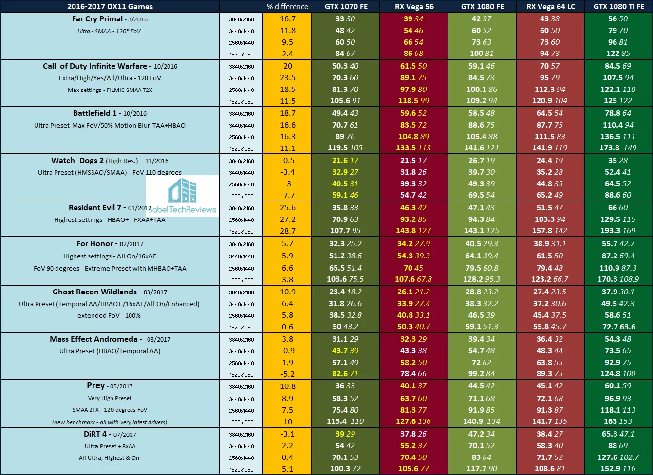 The GTX 1070 FE results are in the first performance results column and the RX Vega 56 results are shown in the second performance results column. “Wins” are shown in yellow font. The first (yellow) performance results column shows the percentage differences between the RX Vega 56 and the GTX 1070 FE. The third performance column represents the stock GTX 1080 FE results, the fourth performance column represents the RX Vega 64 Liquid Cooled edition results, and the final performance column shows GTX 1080 Ti FE results.