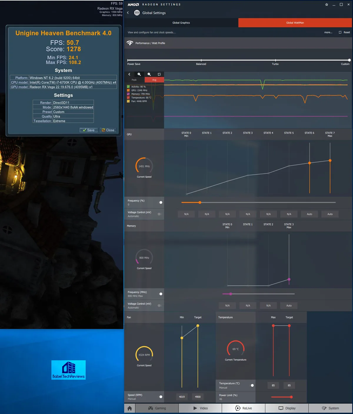 These are the custom gaming global settings that we used for the RX Vega 56 that gave us slightly better performance than using the “Turbo” Preset. The Power Limit is set to +50%, the temperature is allowed to reach the maximum, and the fan is also allowed to spin up to its maximum, while a minimum of 4,000 rpm are set to prevent thermal throttling.